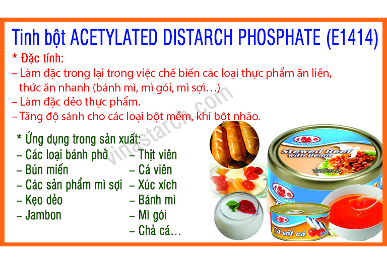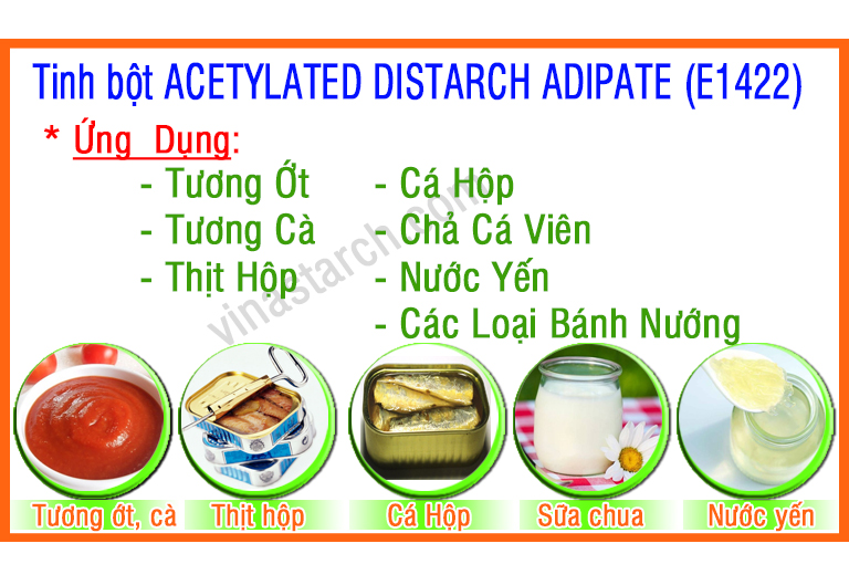 Vinastarch có thể cung cấp hơn 3.000 tấn sản phẩm/tháng. Công ty được thành lập trong bối cảnh nhu cầu thị trường ngày càng tăng về tinh bột sắn và tinh bột biến tính dùng trong các ngành sản xuất, đặc biệt ứng dụng trong ngành sản xuất thực phẩm như mì ăn liền. , các loại kẹo, mì ăn liền, bánh phở, bún, bún tươi, bún khô, bún, tương ớt, tương cà, chả cá, xúc xích thịt bò viên đóng hộp, cá hộp, bánh gạo, bánh bông lan, hạt nêm, sữa chua, sữa chua, đậu phộng da cá, đồ ăn chay…